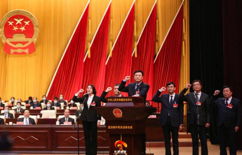 大會舉行憲法宣誓儀式。新當選的區(qū)監(jiān)察委員會主任、區(qū)人大常委會副主任、委員集體向憲法宣誓。